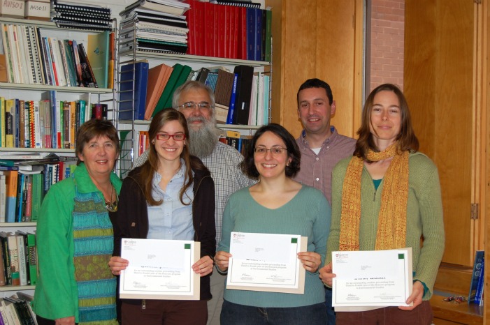2010-11 Alumnus Environmental Studies Scholarship winners pictured left to right are Jessica Pelow, Elizabeth Saikali and Sarah Walker. Also pictured are Judy Eddy [Undergraduate Studies Administrator], Mike Brklacich [Chair of DGES] and Michael Pisaric, Environmental Studies Supervisor. This scholarship is awarded annually to an outstanding student[s] proceeding from third to fourth year of the Honours Program in Environmental Studies.