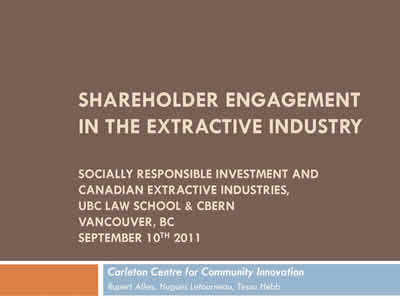 (Rupert Allan, Hugues Letourneau, and Tessa Hebb) a new 3ci research paper was presented at the Socially Responsible Investment (SRI) and Canadian Extractive Industries symposium hosted by the University of British Columbia and CBERN on September 10-11th 2011. The symposium brought together a dozen speakers from the legal, investment, NGO, academic and industry communities to discuss a range of legal, policy and financial issues concerning how investors attempt to influence the social and environmental performance of extractive industries and to consider potential reforms. For paper abstract click here. For presentation click here.