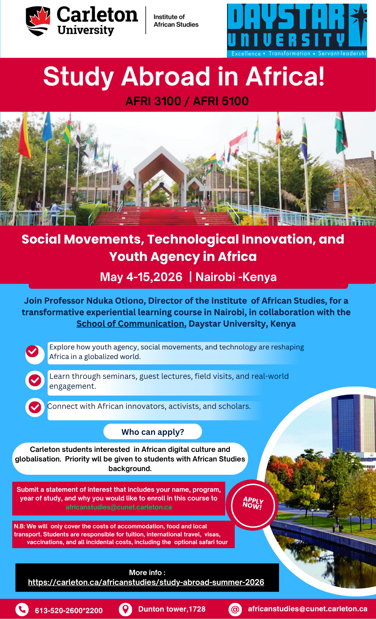 In order to register, you will first need to submit a statement of interest that includes your name, program, year of study, any related courses on Africa you have taken, and why you would like to enroll in this course to africanstudies@cunet.carleton.ca by October 30 2025.