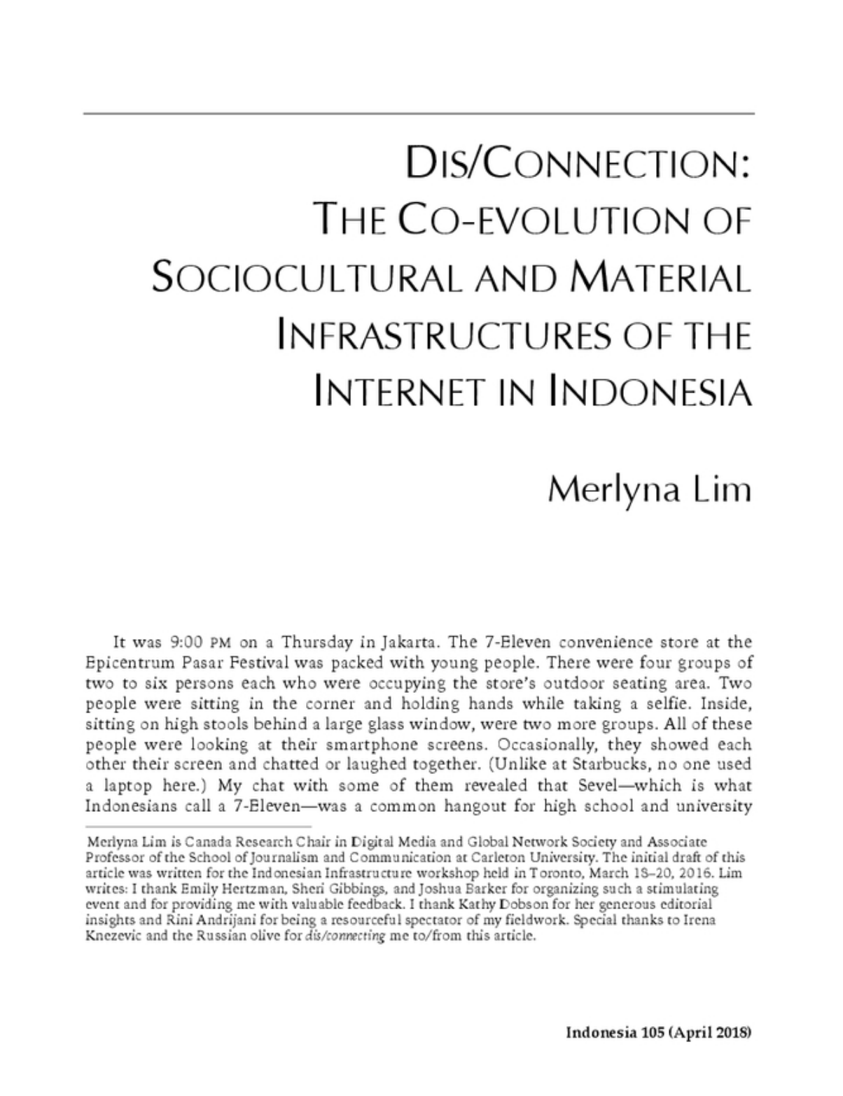 Merlyna Lim just gets another publication out. Titled “Dis/Connection: The Co-Evolution of Sociocultural and Material Infrastructures of the Internet in Indonesia“, her latest article is part of the special issue #105 of Indonesia (published by Cornell University’s Southeast Asia Program) on “Infrastructures”.