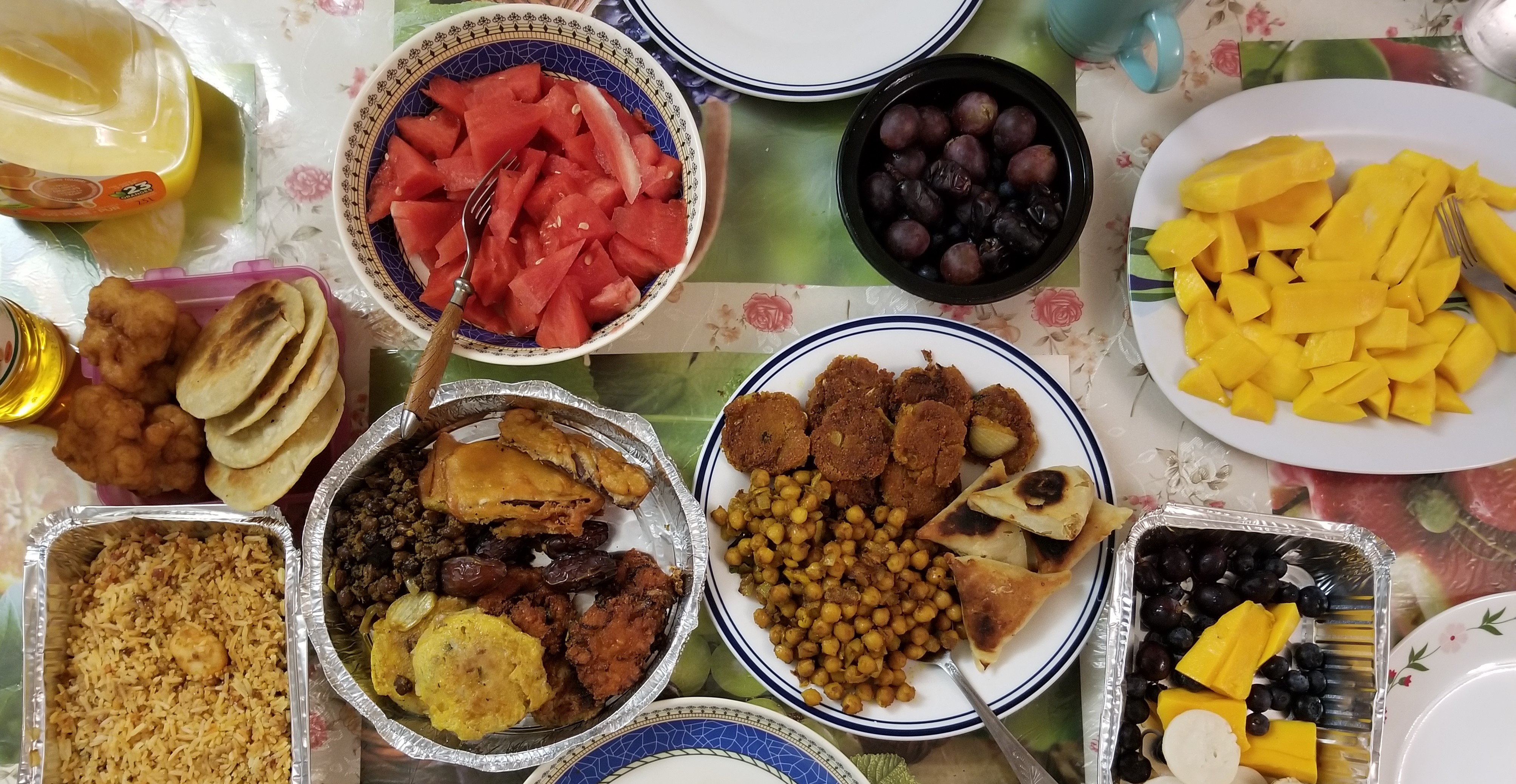 The seemingly mundane everyday activities such as making and eating food, is often filled with social, cultural and symbolic meanings. During Ramadan, meals tend to vary in different Muslim countries during iftar time. In our home, traditionally, we make common Bengali items such as chola (cooked chickpeas), daal boras (a kind of lentil fritter) and beguni (sliced eggplants dunked in flour), which is always accompanied by dates, muri (puffed rice), and a mix of different fruits and drinks (Figure 1). As my mother puts the lentil-paste mix combined with onions, spices and green chillies beside the stove, I take it as my cue to start frying them. While I flip the daal boras with the spatula as the texture of each one turns crispy with the oil sizzling, my mom tells me how in the streets of Bangladesh, vendors deep fry snacks for iftar, a taste that she says is hard to find here in Canada. I have not had the opportunity to have iftar foods actually in Bangladesh. However, making iftar dishes and Bengali meals in general with my family here in Canada, is how I feel a connection to my culture and a bond with Bangladesh. This was not always the case.