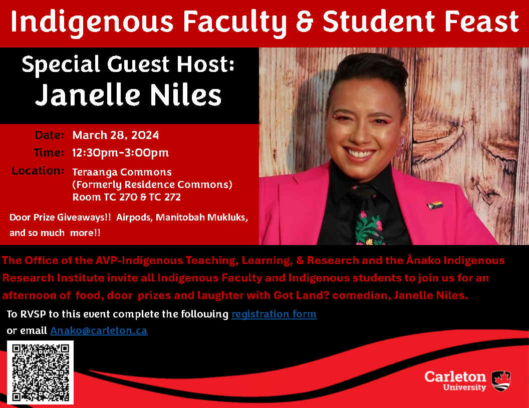 The Office of the Associate Vice President Indigenous Teaching, Learning and Research and the Ānako Indigenous Research Institute invite all Indigenous Faculty and students to an afternoon of food, door prizes and laughter with Got Land? comedian, Janelle Niles.