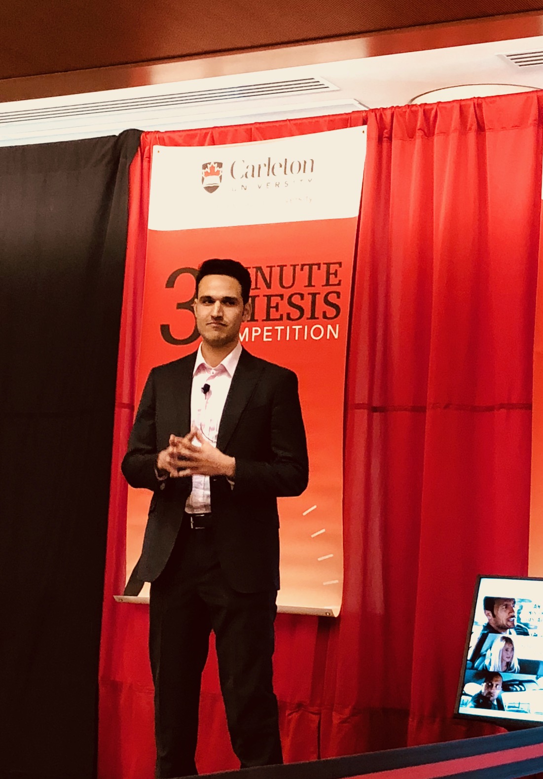 Amin Ghaziaskar was a top 10 finalist and took home the People’s Choice Award at the Carleton three minute thesis – also know as the 3MT – competition for 2018. Amin presented his research in just under three minutes on the topic of biofuels and sustainability. Amin has been working on improving the patented enhanced hydrothermal polymerization biofuel project for his MASC thesis. This project involves both an industry partner (PCS Biofuels) and three co-supervisors (Dr. Basu – Environmental Engineering, Dr. McRae – Mechanical Engineering, and Dr. Lai – Chemistry). Congratulations Amin!