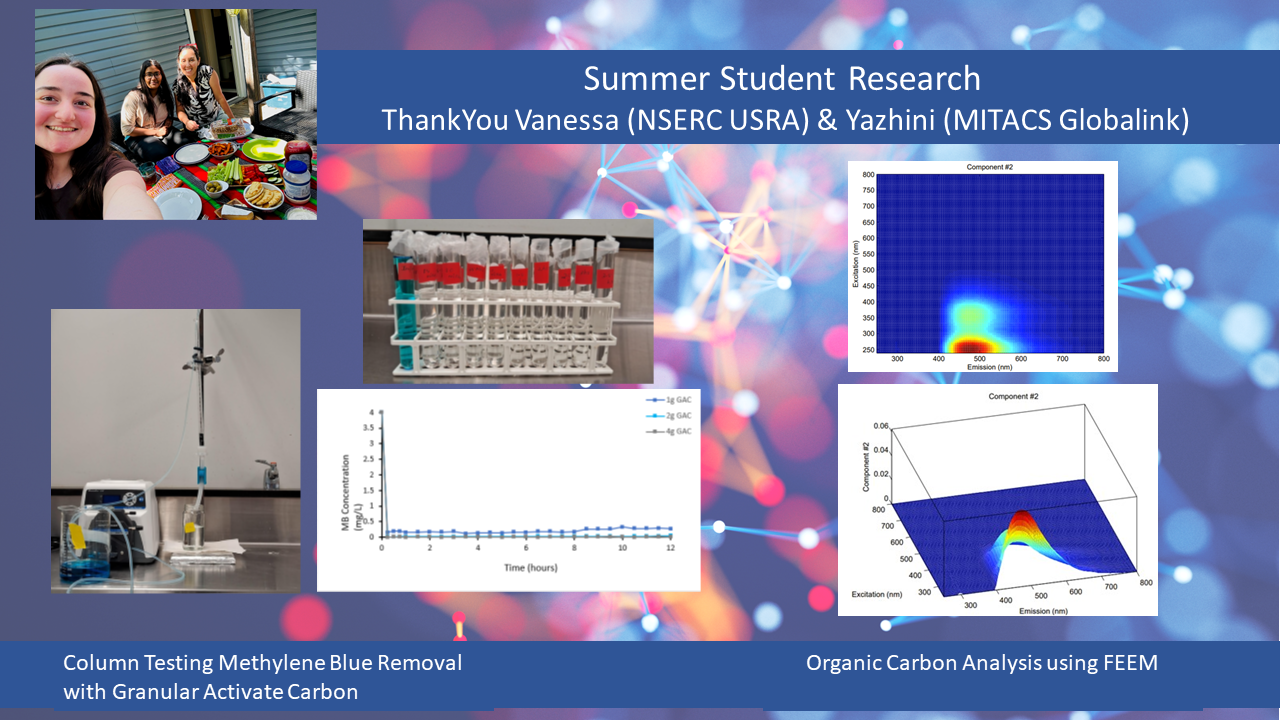 Thank You Vanessa N, and Yazhini S. for joining the Basu Research Group this summer. Both students worked together in a team environment to promote cross learning opportunities. Vanessa focused on Fluorescence Excitation Emission Matrix (FEEM) spectroscopy where she focused on measurement of dissolved organics in different water sources. Yazhini worked on filtration and biofiltration research, and was able to set up multiple column tests to assess for Methylene Blue Removal with Granular Activated Carbon (GAC). Both students also participate in NSERC CREATE WASH undergrad training seminars with Yazhini presenting her work at an Undergrad student forum.