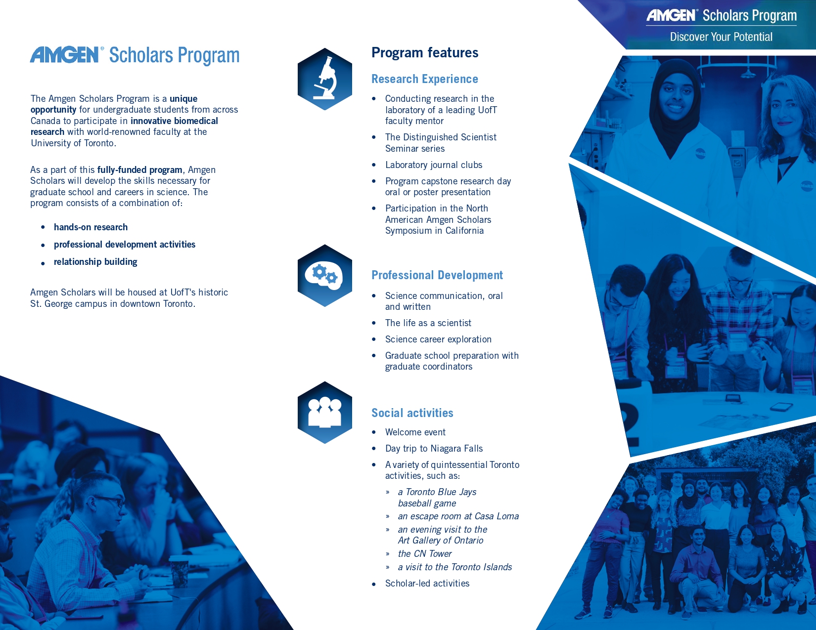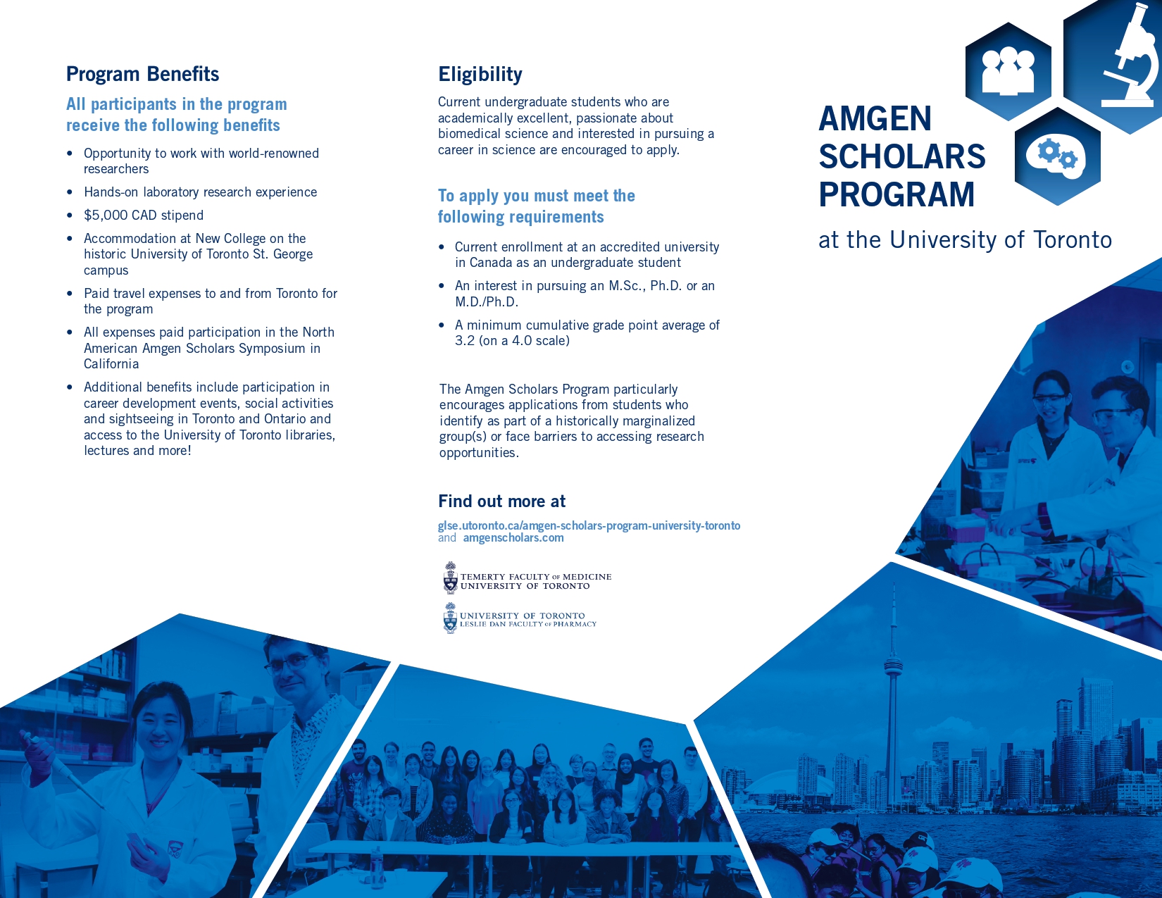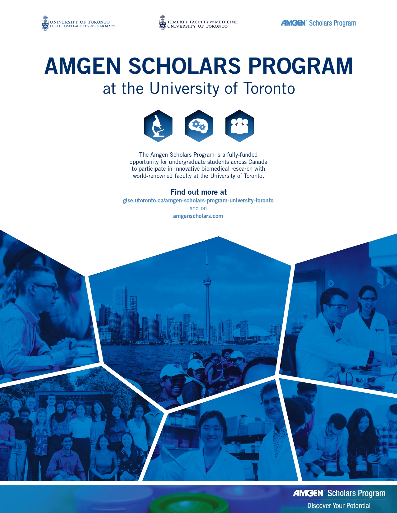 Since Summer 2019, the University of Toronto has hosted the Amgen Scholars Canada Program, a fully funded program that provides an opportunity for undergraduate students to conduct biomedical research at the University of Toronto. For the next summer intake, we are actively seeking to increase student diversity by increasing the representation of universities across Canada.