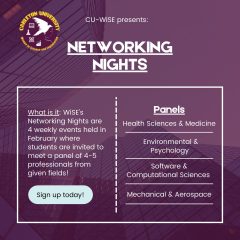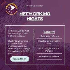 - Every week in February, WiSE will be hosting a networking night featuring 4-5 professionals and academics from different fields.