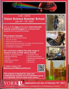 This program will take place July 10 – 14, 2023. Our one-week all expenses paid vision science program is an excellent opportunity for your undergraduate students to do a deep dive into vision related research and to learn from world leaders in the field. Please note that applications must be received by February 10th, 2023. For more information, students should visit the summer school website, at https://www.yorku.ca/cvr/summer-school/