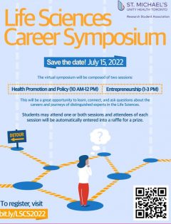 5th Annual Life Sciences Career Symposium: The St. Michael’s Hospital Research Student Association’s 5th Annual Life Sciences Career Symposium will be taking place on July 15, 2022! Join us to learn, connect, and ask questions about the careers and journeys of distinguished experts in the life sciences. The symposium will be composed of two sessions: Health Promotion & Policy (10 AM-12 PM) and Entrepreneurship (1-3 PM). Students may attend one or both sessions and attendees of each session will be automatically entered into a raffle for a prize. To register, please visit: https://bit.ly/LSCS2022
