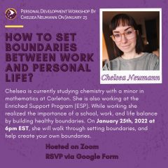 On January 25th @ 6 PM EST, the CUWiSE will be hosting Chelsea Neumann, a student, and facilitator at the Enriched Support Program (ESP), for setting boundaries!
