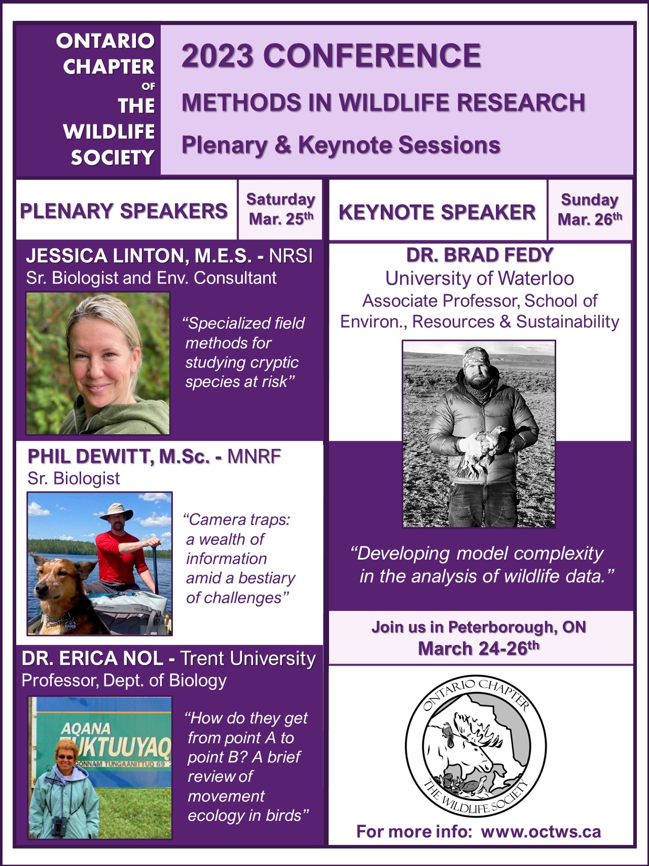 This March 24-26, the Ontario Chapter of The Wildlife Society will be hosting the annual conference in Peterborough, Ontario. The theme of this year’s conference is “methods in wildlife research” and registration is still open. We have a great lineup of plenary speakers and workshops. Please check out our website (http://www.octws.ca/2023-conference.html) and the attached flyers for more information and registration guidelines.