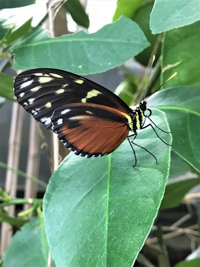 Butterflies have chemoreceptors on their feet that act like human taste buds. A female butterfly will drum the leaves with her feet to release the plant juices. She is searching for the right plant chemicals and if it is a match will lay her eggs. These chemoreceptors sense dissolved sugars in fermenting fruit. A favorite snack for tropical butterflies. – Greenhouse Manager, Ed Bruggink