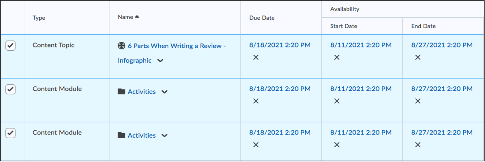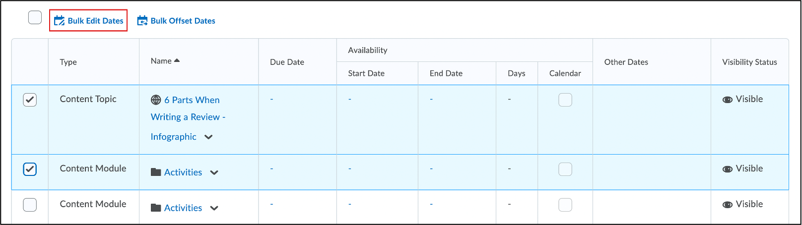 Bulk edit dates is useful to set the same start, end, and/or due date(s) for multiple items simultaneously. This feature can also be used to bulk edit calendar visibility.