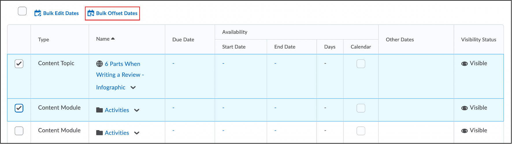 Bulk offset dates allows you to move the start, and/or due dates for course items forwards or backwards by a specified number of days. Bulk offset dates is useful for bulk editing/shifting the dates for a course that was brought over from another term or year.
