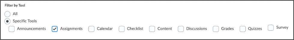 The Manage Dates table can be filtered by tool or other advanced filter options. This can be useful to select which course items to view and edit within the table.