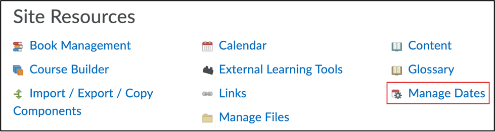 The Manage Dates tool provides a quick way to view and adjust dates in your course from one central place. You can edit the start, end, and due dates for quizzes, assignments, discussions, surveys, content items, etc. Dates can be changed individually or using the bulk edit and bulk offset features. The Manage Dates tool can be used to adjust the dates for course content that has been copied over from a previous term/year.