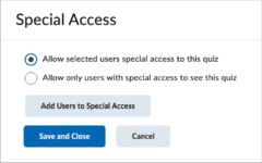 The Special Access feature can be used to set accommodations for an individual quiz or assignment in Brightspace. You can use Special Access to create a quiz/assignment accommodation for an individual student or a select group of students.