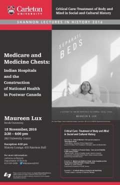 The next Shannon lecture, co-sponsored by the Department of Health Sciences, will be given on November 18 by Professor Maureen Lux who will talk about the history of the treatment of indigenous peoples in the Canadian healthcare system after 1945. Maureen Lux teaches history at Brock University. Her latest book, Separate Beds: A History of Indian Hospitals in Canada, 1920s to 1980s was published earlier this year and she is currently collaborating on a book about reproductive politics in 1970s Canada.