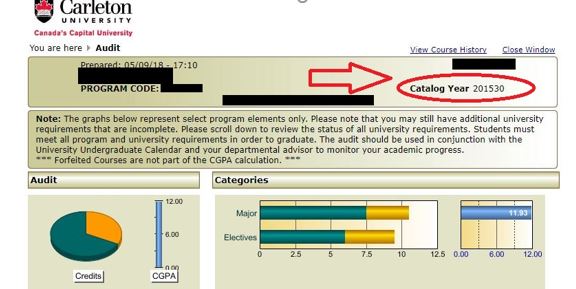 These degree progression charts aid you in choosing your courses. The charts are specific to your Catalog year not your Admit term. You can find your Catalog year on the top right corner of your audit. See red arrow in figure below.