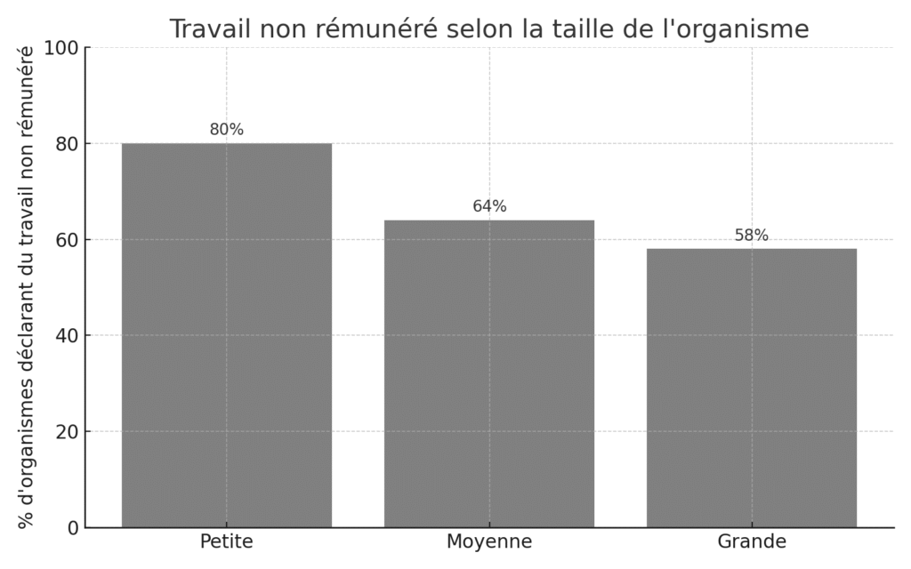 Les organismes de bienfaisance dont les dépenses annuelles sont inférieures à 61 500 $ ont déclaré les taux les plus élevés de travail non rémunéré, tandis que ceux dont les dépenses sont supérieures à 229 000 $ ont déclaré les taux les plus faibles. Cette relation entre la taille de l’organisation et le travail non rémunéré est statistiquement significative X2 (2, N = 779) = 9,47, p = 0,0009.
