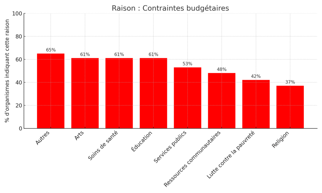 En ce qui concerne les contraintes financières, les secteurs des arts, de la santé et de l’éducation se distinguent particulièrement. Les contraintes budgétaires conduisant le personnel à fournir un travail non rémunéré étaient les moins importantes dans les organisations religieuses. Cette variation entre les organismes caritatifs ayant des objectifs différents est statistiquement significative X2 (7, N = 477) = 17,3, p = 0,016.