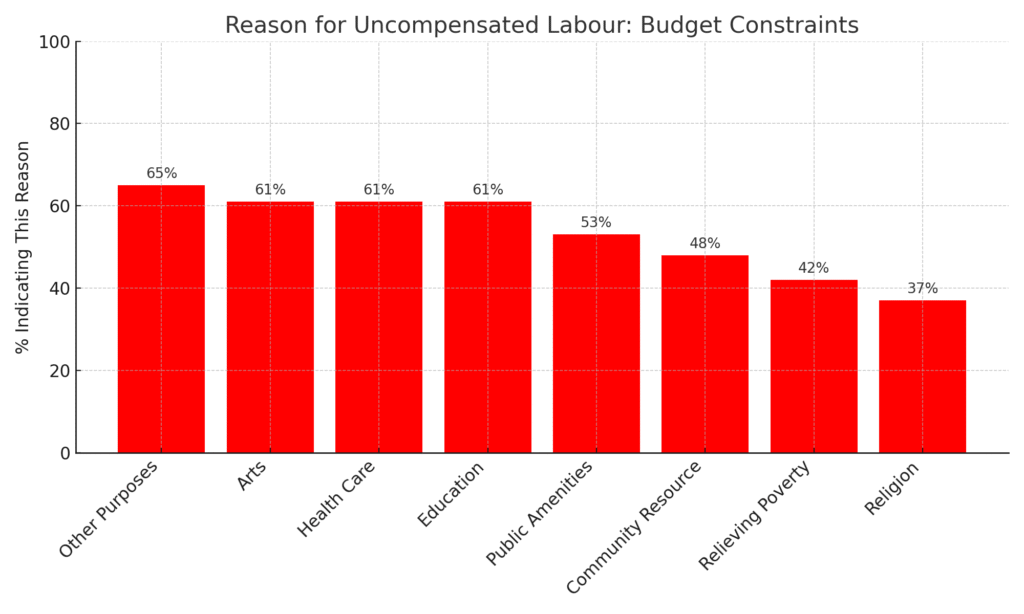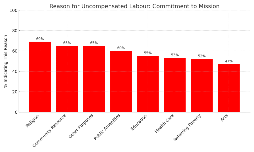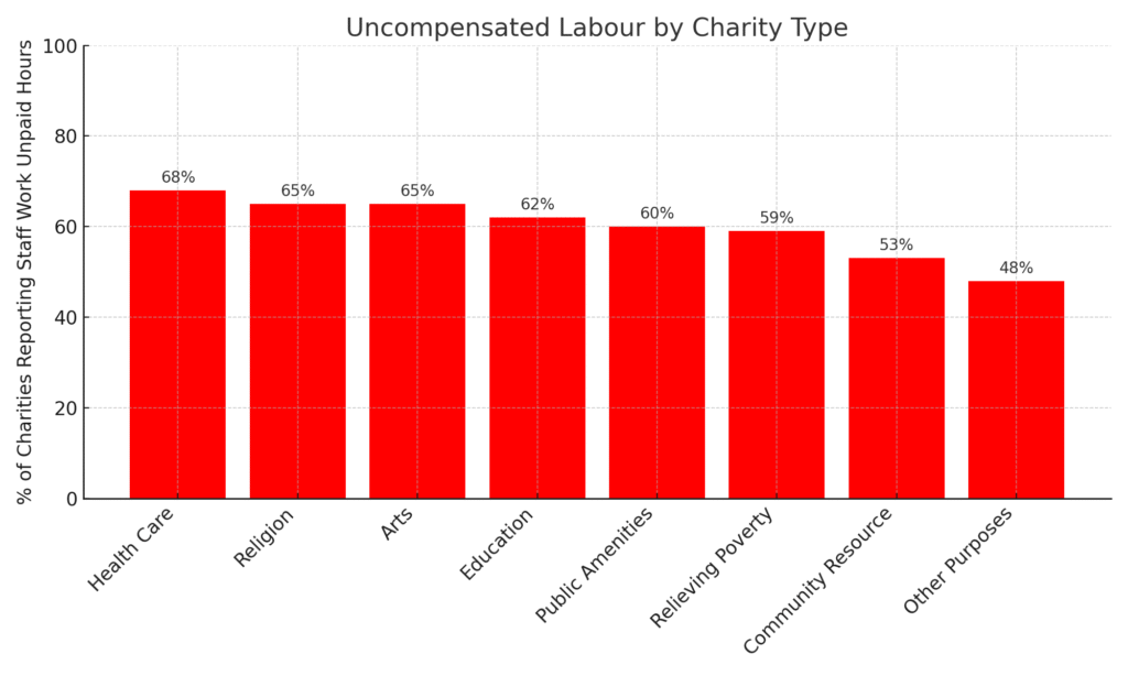 Still, the structural pressures can’t be ignored. Among the 54% of charities citing insufficient staffing as a reason for staff providing unpaid labour, this was most common in public amenities, the arts, and educational organizations, with marginal statistical significance X2 (7, N = 477) = 14.1, p = .005.