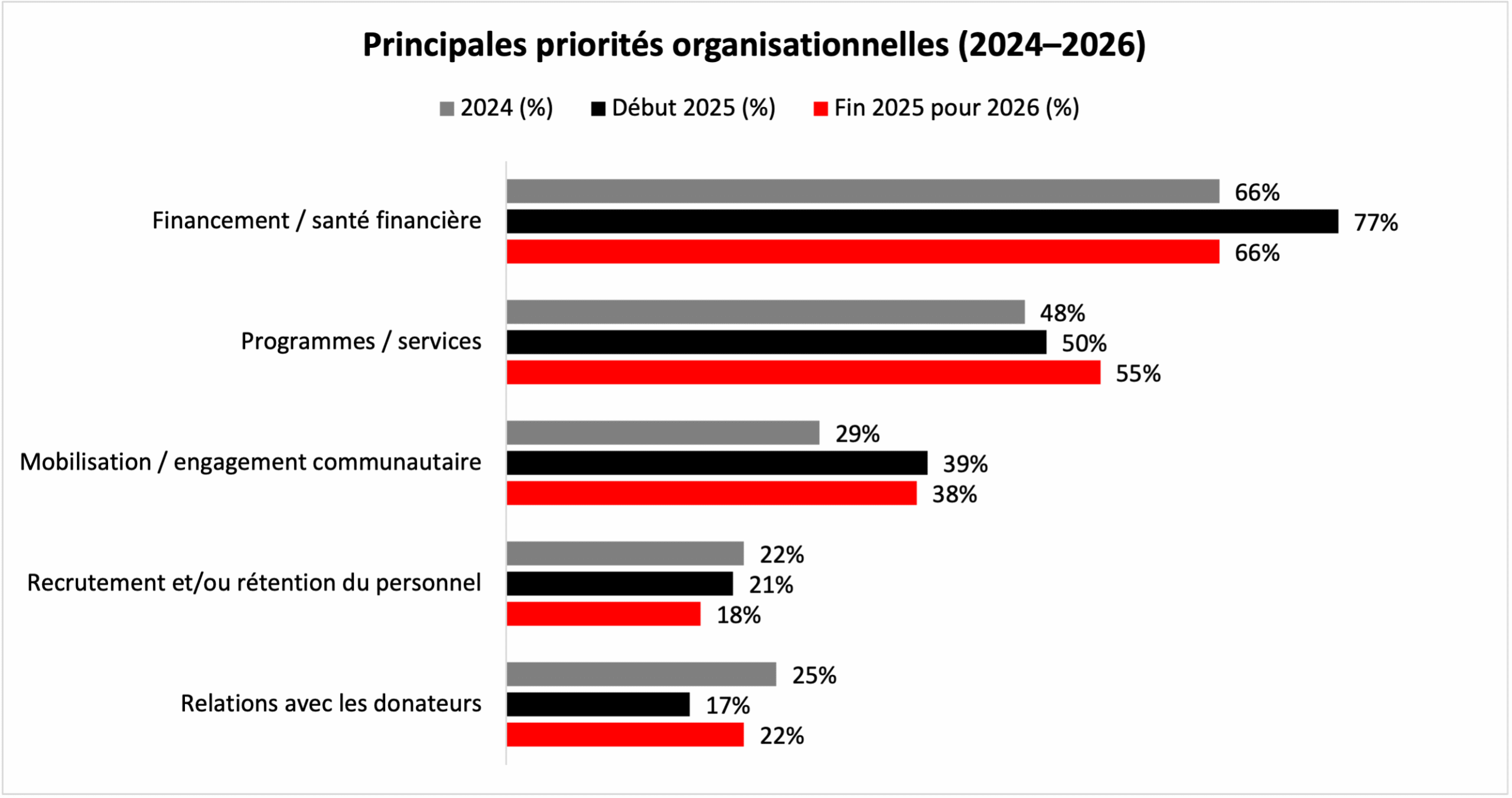 Si la santé financière reste la priorité absolue pour 66 % des organismes de bienfaisance participants, d’autres priorités importantes indiquent un changement notable dans les activités vers ce que les organismes de bienfaisance peuvent contrôler. L’importance de la prestation de programmes/services a atteint son plus haut niveau en trois ans, citée par 55 % des organisations, contre 50 % en 2025 et 48 % en 2024. De même, la « sensibilisation/l’engagement communautaire » a été signalée comme une priorité nettement plus importante pour 2026 (38 %) qu’en 2024 (29 %).