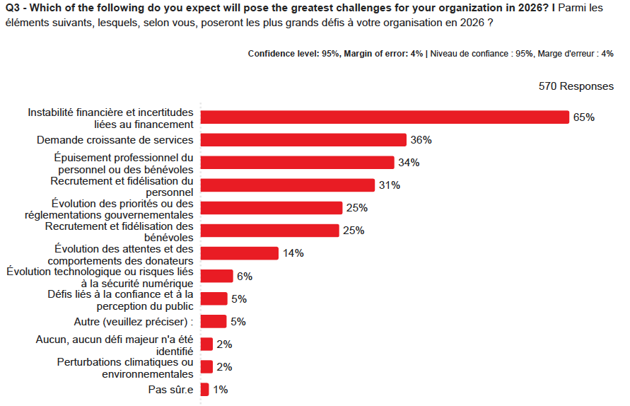 Si l’instabilité financière reste un défi majeur pour 65 % des organisations, la pérennité de la main-d’œuvre est apparue comme un facteur de pression déterminant pour le secteur. Les organismes de bienfaisance font état de défis persistants liés à la demande croissante de services (36 %), à l’épuisement professionnel du personnel ou des bénévoles (34 %), au recrutement et à la fidélisation du personnel (31 %) et au recrutement et à la fidélisation des bénévoles (25 %).