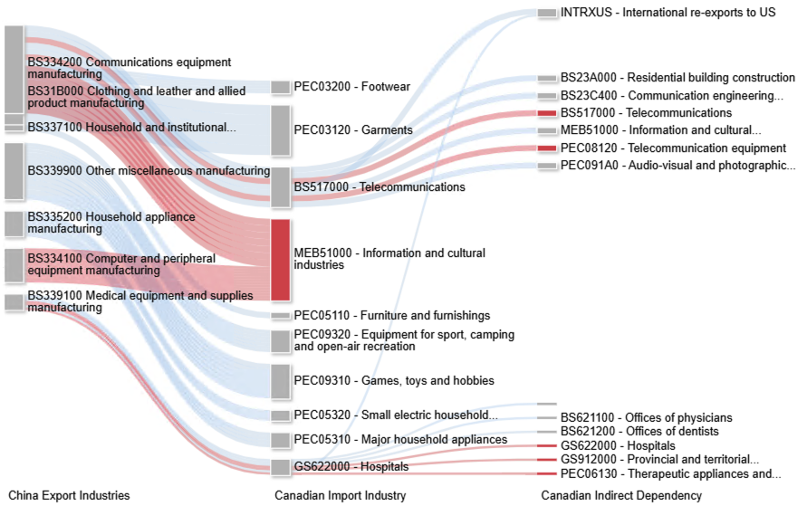In Figure 3 below, the next order of indirect industrial dependencies is shown on the far right. This last relationship–layer used a minimum value of $60M for imported Chinese goods for the purposes of creating their own goods and services (intermediate consumption). By looking at indirect supply relationships, we can see even more hard-to-assess dependencies associated with Chinese exports to Canada and the implications for industries and citizens.