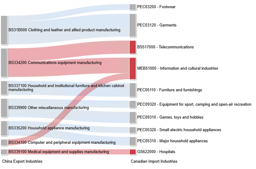 In Figure 1,2 and 3 below, the Chinese export industry on the left sends goods or services to the consuming industry on the right, which can be using the goods for creating more goods or services (Intermediate consumption) or a form of final consumption (like personal consumption or capital investments). The thickness of each bar represents the proportional value of the Chinese export industry, the curved lines connecting the industries indicates the fraction of that value flowing to importing Canadian consumer (intermediate industry or final). The codes next the Industry names are the standardized North American Industry Classification System (NAICS) employed by StatsCan and the U.S. Bureau of Economic Analysis.
