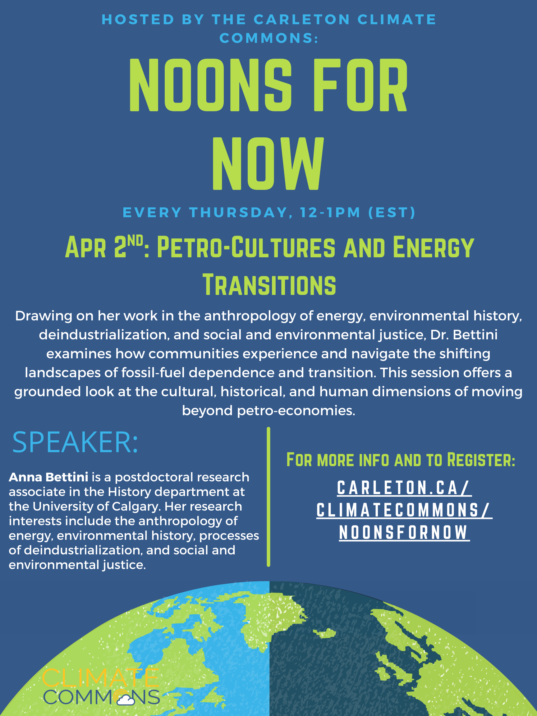 Speaker: Anna Bettini postdoctoral research associate in the History department at the University of Calgary. Her research interests include the anthropology of energy, environmental history, processes of deindustrialization, and social and environmental justice.