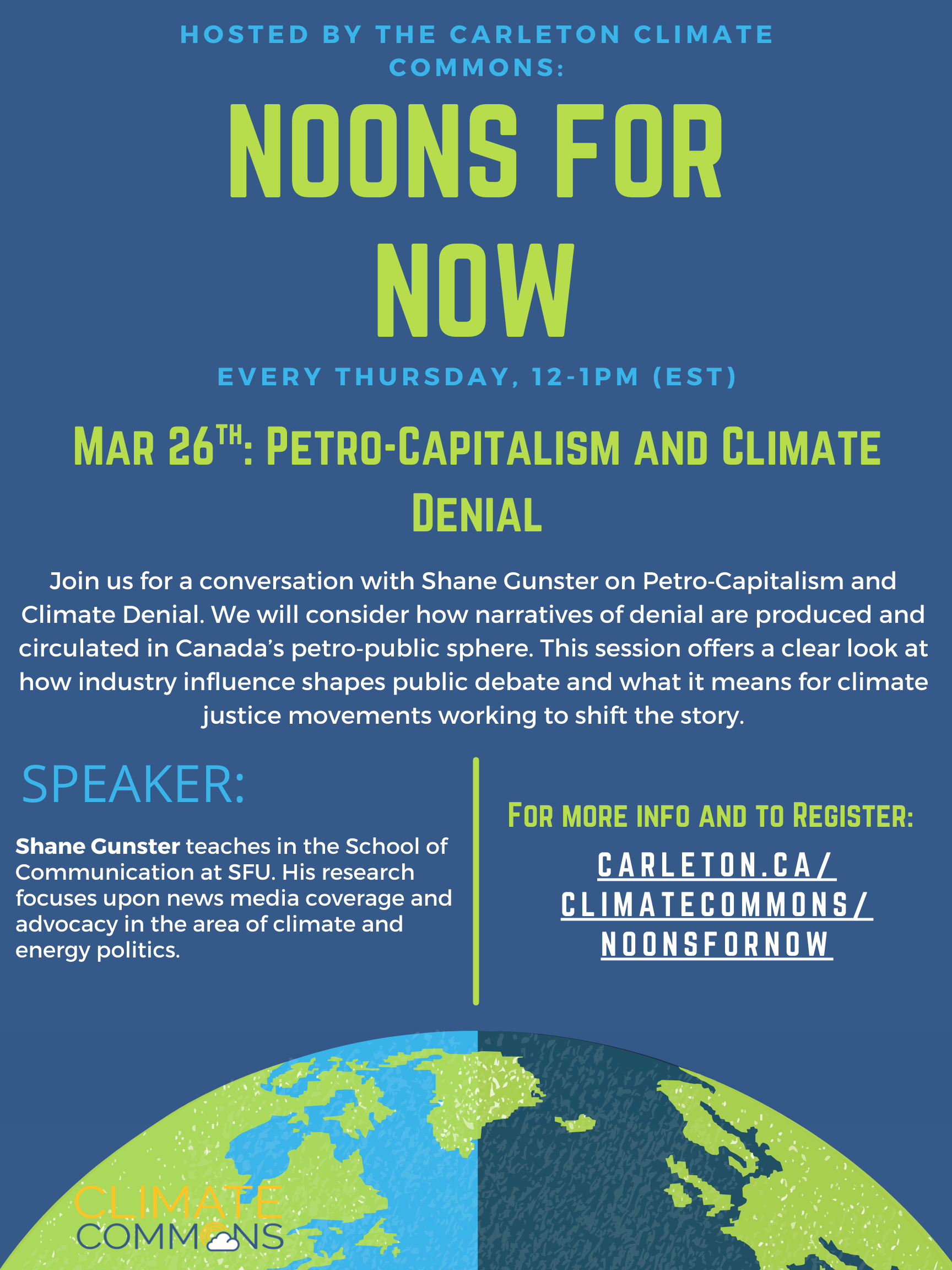 Join us for a conversation with Shane Gunster on Petro‑Capitalism and Climate Denial. We will consider how narratives of denial are produced and circulated in Canada’s petro‑public sphere. This session offers a clear look at how industry influence shapes public debate, and what it means for climate justice movements working to shift the story.