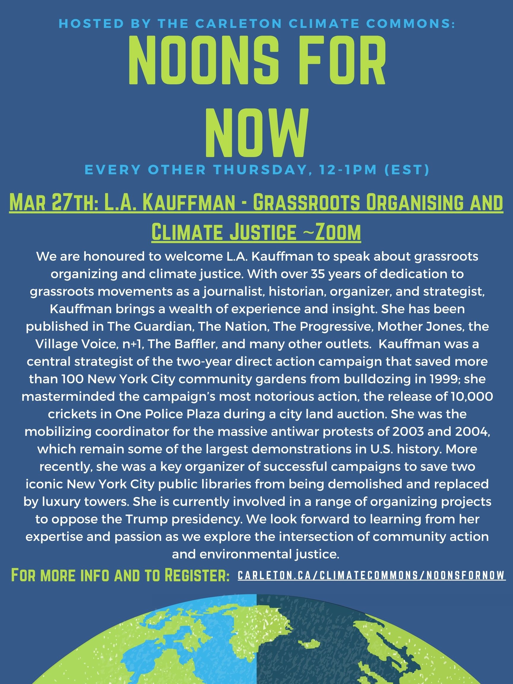 We are honoured to welcome L.A. Kauffman to speak about grassroots organizing and climate justice. With over 35 years of dedication to grassroots movements as a journalist, historian, organizer, and strategist, Kauffman brings a wealth of experience and insight. From her work saving over 100 New York City community gardens to mobilizing some of the largest antiwar protests in U.S. history, her contributions to activism are nothing short of inspiring. We look forward to learning from her expertise and passion as we explore the intersection of community action and environmental justice.