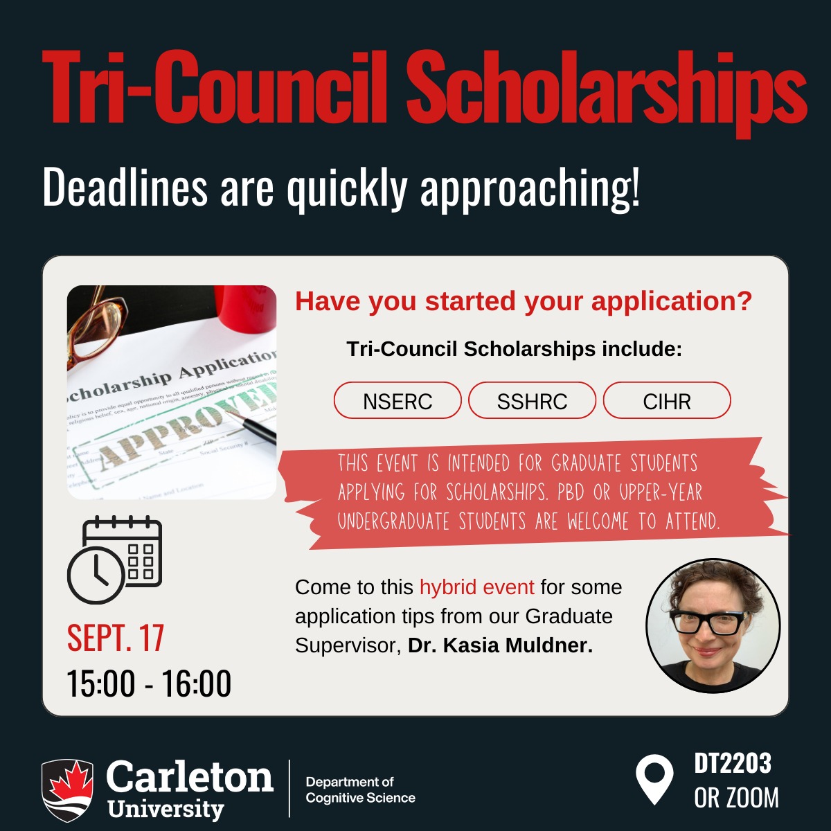 Applying for scholarships? Join us on September 17th, 15:00-16:00 (during the CU Cog Sci Colloquium) for a Tri-Council Scholarship Workshop!