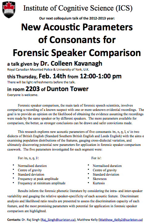 Please join us on February 14th, 2013 in Room 2203 DT, from 12:00 – 1:00 p.m., where forensic linguist Dr. Colleen Kavanagh of the Royal Canadian Mounted Police will be giving the talk, New Acoustic Parameters of Consonants for Forensic Speaker Comparison.