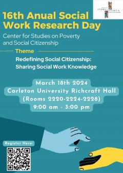 The Center for Studies on Poverty and Social Citizenship (CSPSC) welcomes paper and poster submissions for the 16th annual Social Work Research Day (SWRD16). The theme for SWRD16 is “Redefining Social Citizenship: Sharing Social Work Knowledge”, highlighting the past and emerging insights about social citizenship, political, civil, and social engagement with community.