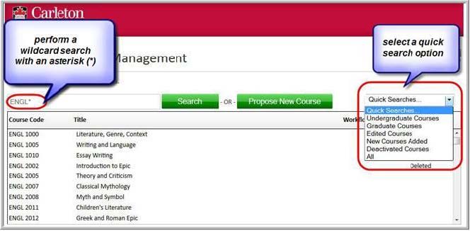 - The Quick Searches drop down menu allows you to search by Undergraduate, Graduate, Edited, New, Deactivated or by All courses.