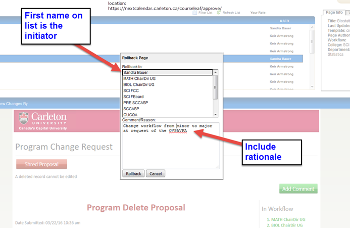 Step 3: If you do not have Approve access to the item because it has traveled to a further step in workflow or you are not an approver, contact a CourseLeaf administrator (courseleaf@carleton.ca) or the individual in the role for that workflow step (the Associate Dean, for example). Tell them that the workflow needs to be changed, and ask them to roll the item back to the originator of the proposal (not to the ChairDir role) and therefore out of workflow. The originator’s name appears at the top of the list of Rollback options in the Approve window.