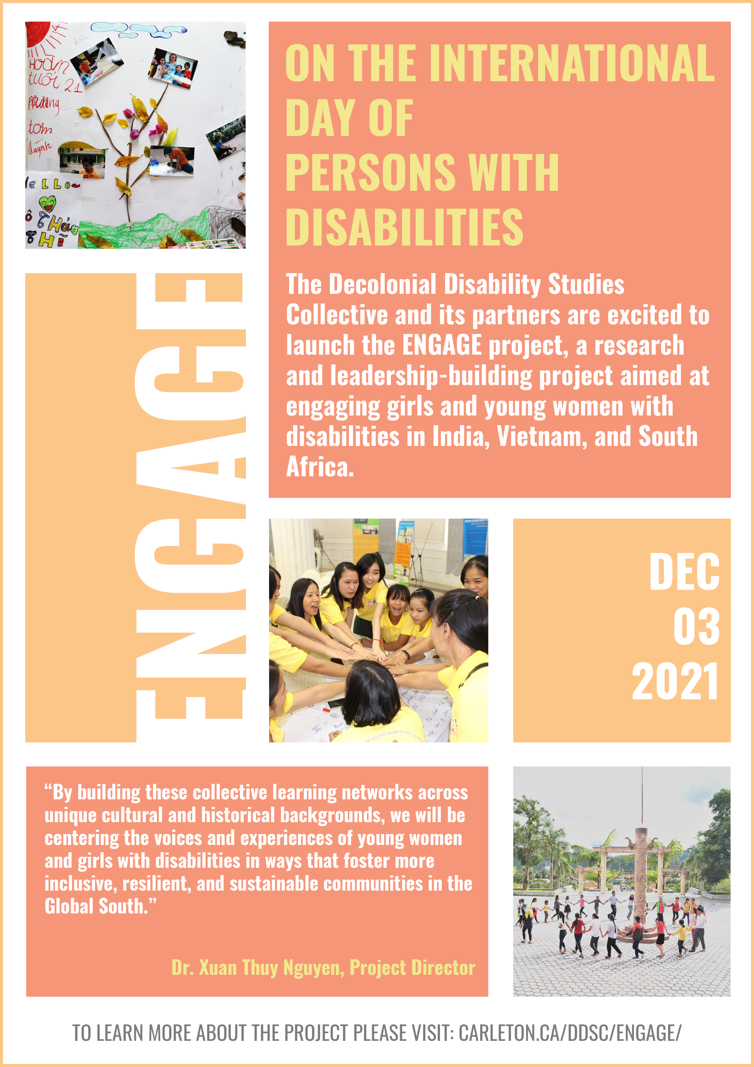 Ottawa, ON – Today, on the International Day of Persons with Disabilities, the Decolonial Disability Studies Collective based at Carleton University is excited to launch the ENGAGE project, a research and leadership-building project aimed at engaging girls and young women with disabilities in India, Vietnam and South Africa. The “Learning with and from the global South: Opportunities for engaging girls and young women with disabilities across Southern spaces (ENGAGE) project” is a learning network of young women and girls with disabilities from across three countries in the Global South – Vietnam, India and South Africa. The project aims to support young women and girls living with disabilities to engage their leadership capacities and to support their activism for gendered disability equality, inclusion, and respect.