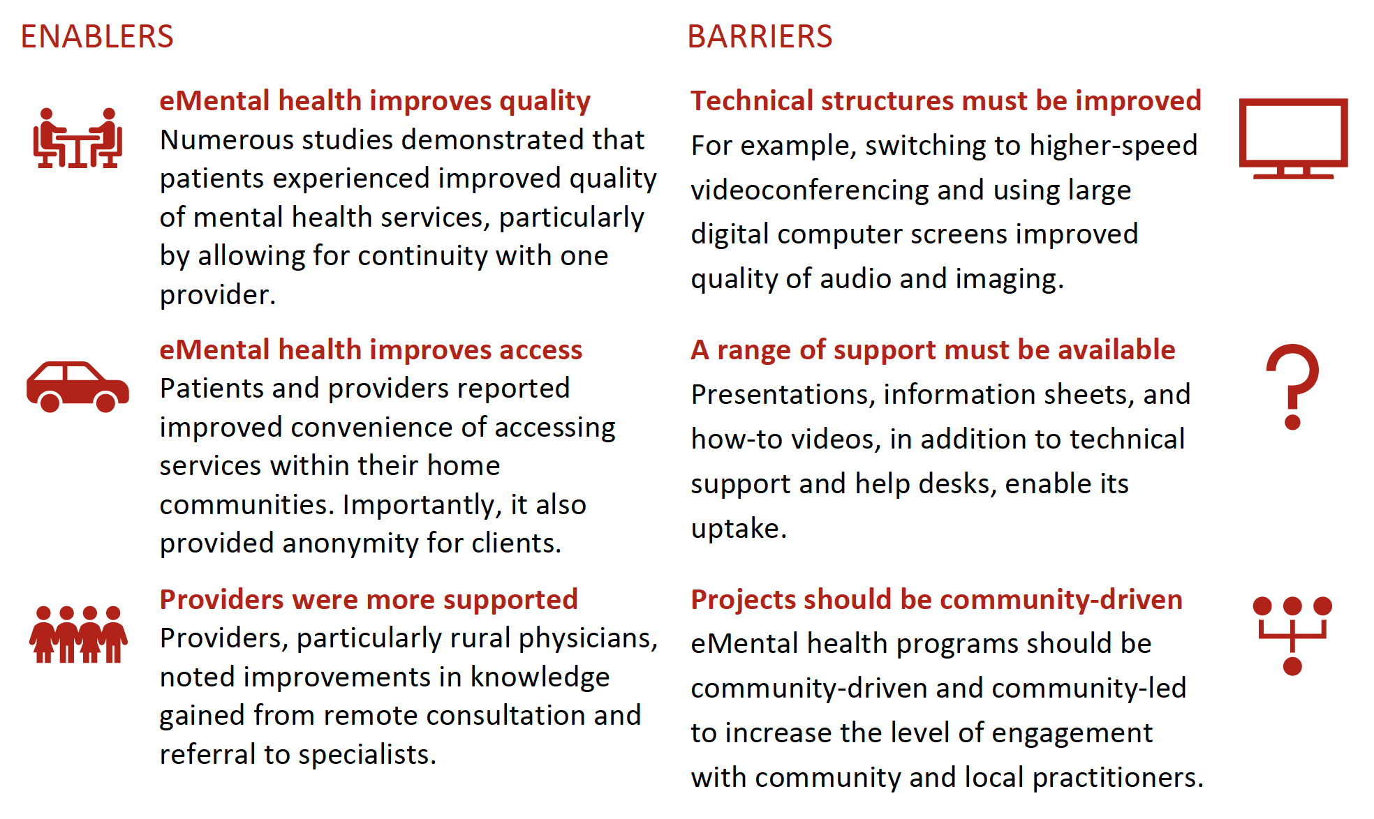 eMental health aims to bridge the gap between rural and urban mental health services by introducing electronic methods such as teleconferencing or video conferencing for psychological services, virtual referral to psychiatrists, and sharing of electronic records. Successful integration of the technology remains a challenging task, with key actors, enablers, and barriers all influencing its success.