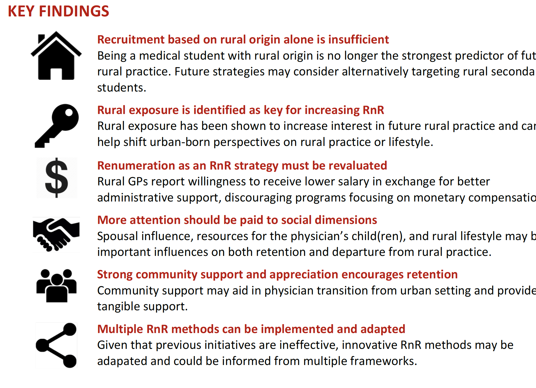 In Canada, 1 in 7 physicians will leave rural practice within two years. Strategies to address these turnover rates and the lessening interest in entering rural practice have focused on supporting recruitment and retention initiatives (RnR) to first bring physicians into rural practice and then encourage physicians to continue in rural practice beyond the short-term.