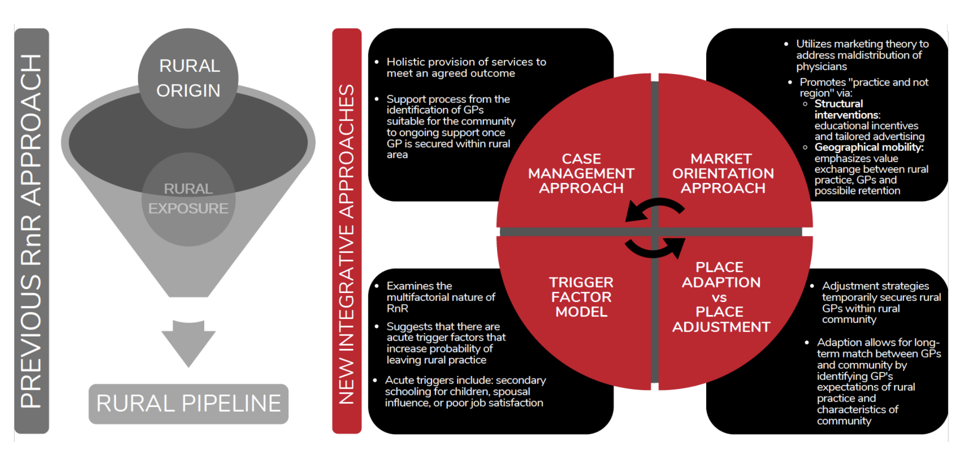 Given that many previous RnR initiatives follow similar strategies that are all largely unsuccessful, it is paramount that new methods of RnR for rural physicians are investigated and trialed. Findings in this review, such as the fact that renumeration must be re-evaluated, further emphasize the need to shift previous conceptualizations of RnR initiatives. Four main conceptual frameworks used in RnR initiatives for rural physicians were identified in this review.