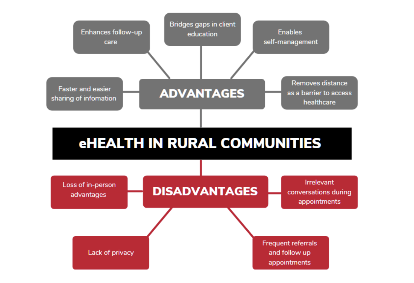 eHealth technologies have been promoted in rural and remote communities as they have demonstrated the potential to dissolve barriers of access to healthcare services, facilitate efficient health service delivery, improve client care, and health outcomes in hard-to-reach areas (13). However, further research into the advantages and disadvantages of eHealth services in rural and remote communities is warranted. Thus, this report aims to identify the advantages and disadvantages of eHealth services among service users in rural and remote communities in Australia and Canada; specifically, examining the role eHealth plays in follow-up care, client experiences using eHealth as an alternative to face-to-face appointments, and suggestions for future implementation.