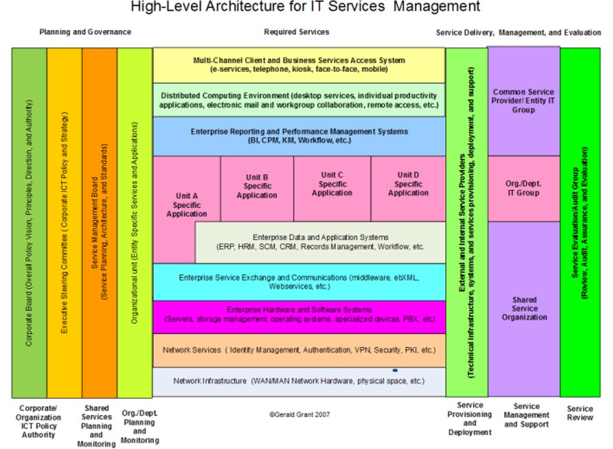 Dr. Grant’s research work focuses on the importance of Digital Service Architecture, as well as the importance of understanding the end goal and the targeted audience/users. As he points out, often there is a lack of understanding that digital services are extraordinarily complex, with many “different issues, different layers, different outcomes, which all need to be addressed in their proper spaces.” That is why any digital strategy needs to “apply a layered architecture view” and “encapsulate issues while understanding their connections.” Dr. Grant’s model for the high-level architecture for IT services management is depicted in the image below and is of particular importance for the Technology Roadmap that accompanies Carleton University’s Digital Strategy.