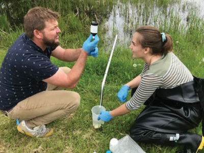 8 Wing Environment’s Contaminated Sites Manager, Mr. Chris McRae, is shown on the left with Defence Construction Canada’s Summer Student, Ms. Claire Woodfield (Honours Bachelor of Engineering (Environmental), Carleton University) on the right, conducting surface water quality sampling along the flooded Bay of Quinte shoreline on 8 Wing/CFB Trenton’s Federal Lands. DND/8 Wing Environmental Management provides contaminated sites management under the Government of Canada’s Federal Contaminated Sites Action Plan. Demonstrations of scientific field sampling techniques and methodologies, while using proper personal protective equipment, are great learning experiences for field scientists and engineers. The results of the water samples will help us to better understand the general chemistry and composition of our shoreline and waters. For more information and to inquire about contaminated sites management, please contact +8 Wing Environment.