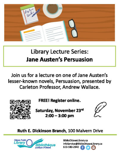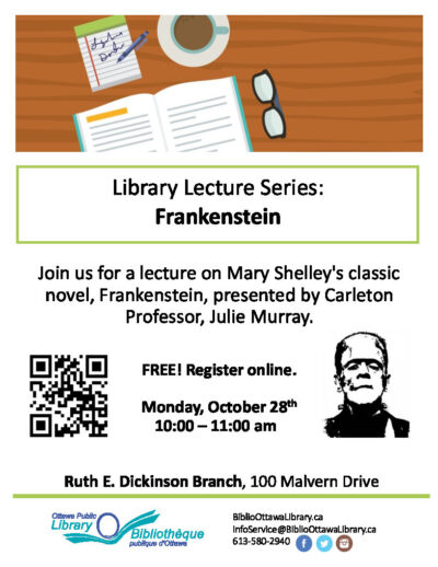 Professor Julie Murray and Professor Andrew Wallace are taking part in the Library Lecture Series hosted by the Ottawa Public Library this Fall. Professor Murray discussed Mary Shelley’s classic novel, Frankenstein, on October 28; and Professor Wallace will discuss the lesser-known Jane Austen novel, Persuasion, on November 23.