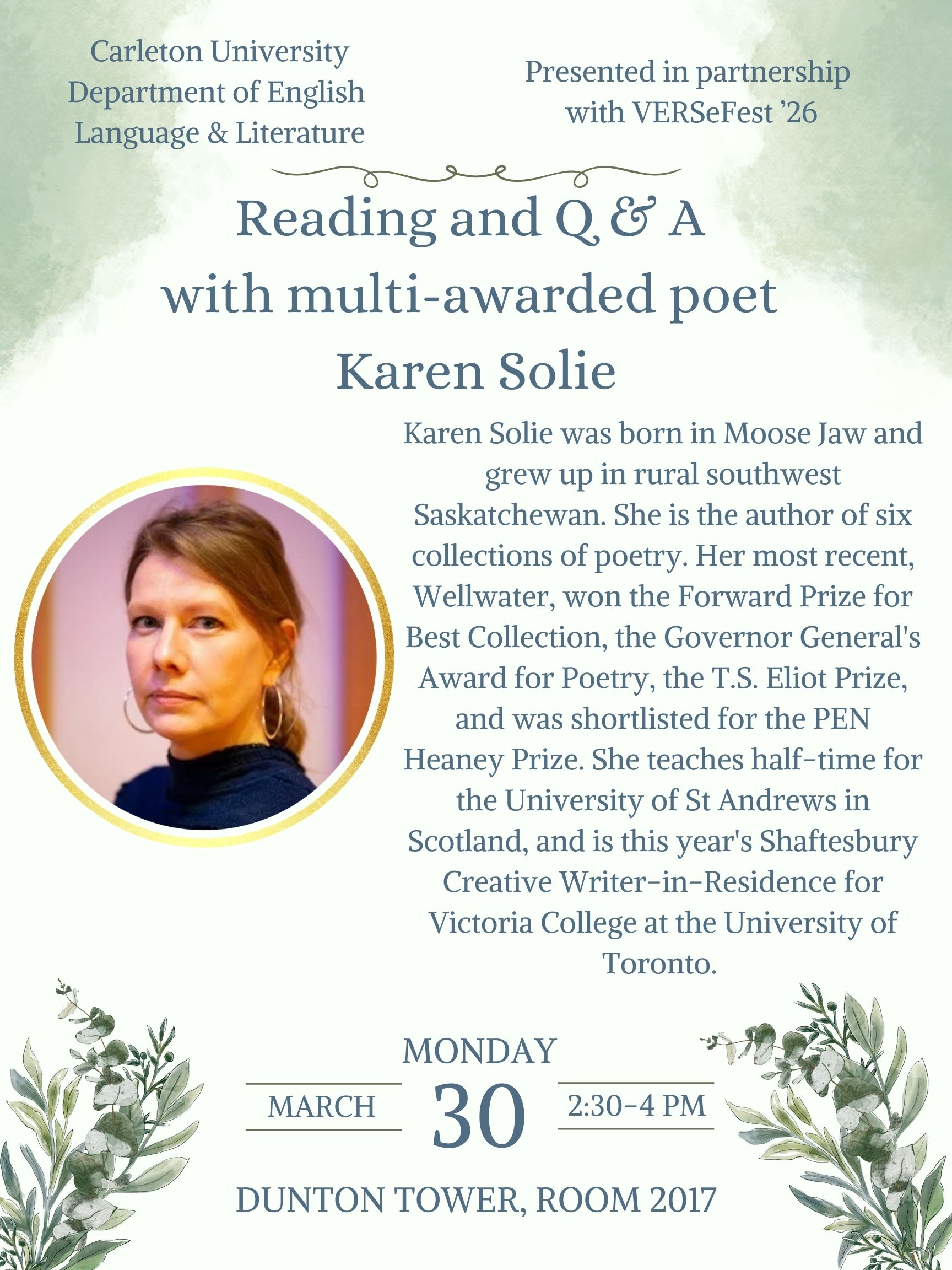 Let’s give a warm Carleton welcome to Karen Solie! Join us for a performance of her work followed by a Q&A on Monday, March 30th, in Dunton Tower Room 2017, from 2:30-4pm.