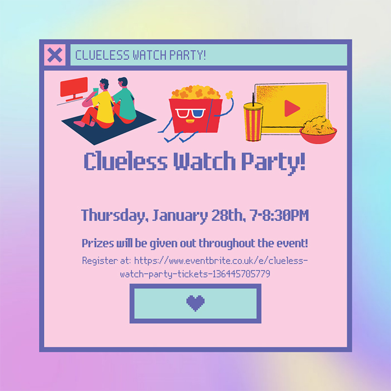 Don’t miss out and join us for our Netflix Watch Part screening the feminist classic ‘Clueless’ from 7:00 p.m. to 8:30 p.m.! There will be a chance to win gift card prizes with fun trivia throughout the movie.