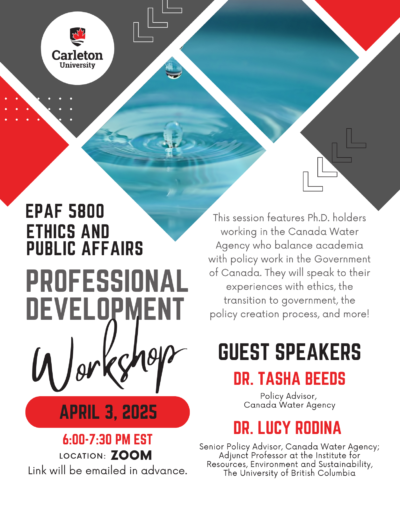 The next EPAF 5800 workshop will take place on April 3rd from 6:00-7:00pm. We will be joined by Ph.D. holders, Dr. Lucy Rodina and Dr. Tasha Beeds working in the Canada Water Agency who balance academia with policy work in the Government of Canada. They will speak to their experiences with ethics, the transition to government, the policy creation process, and more!