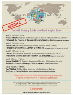 Students and emerging scholars that wish to join the “Mobility & Politics Collective” are invited to send an email to mobilitypoli@gmail.com and to follow our twitter feed @mobpoli. Questions can also be addressed to Prof. Geiger (martin.geiger@carleton.ca) directly.