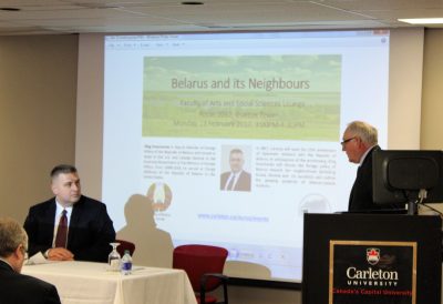 On Monday, February 13, 2017, the Institute of European, Russian and Eurasian Studies hosted Mr. Oleg Kravchenko, Deputy Minister of Foreign Affairs of the Republic of Belarus. Mr. Kravchenko spoke on the upcoming anniversary of Belarus-Canada relations. In 2017, Canada will mark the 25th anniversary of diplomatic relations with the Republic of Belarus. The event inspired Mr. Kravchenko to discuss the foreign policy of Belarus towards their neighborhood including Russia, Ukraine, and Eastern European countries and he provided an outline of the growing potential for Belarus-Canada relations